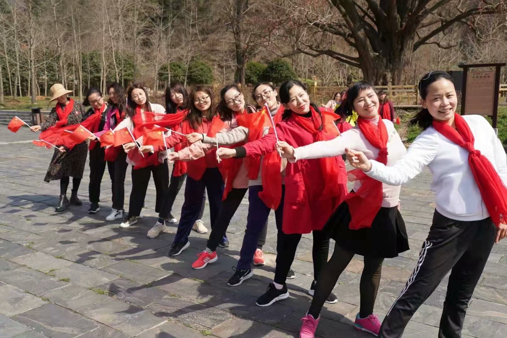 上午12时,正在银杏广场游览的游客被骤然响起的“大漠敦煌”旋律所吸引,在高大的千年银杏树下,来自随州职业技术学院的苏江华、张术、吴冉冉、张敏四位老师朗诵了《我的祖国》。随后,随州职业技术学院教师陈玉荣演唱了《我爱你中国》。风景如画,游人如织的大洪山风景名胜区千年银杏谷广场,顿时形成一个热情的红色海洋。随州职业技术学院教师魏丹、倪福缓缓从人群中走出,站在广场中央,放声歌唱“我和我的祖国”。当大家熟悉的我和我的祖国,一刻也不能分割……”旋律在广场上空萦绕,在音乐的感染下的现场游客、市民纷纷拿出手机记录下这动情的一幕,更有许多人主动加入到表演的队伍中,共同高歌,用发自内心的声音,用根植血液的情怀歌唱祖国!