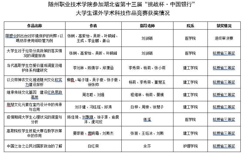 我校于2月中旬至4月上旬举办星空游戏新版本攻略第十三届"挑战杯”大学生课外学术科技作品竞赛,经过专业评审推选12件作品参加省赛。经湖北省第十三届“挑战杯·中国银行”大学生课外学术科技作品竞赛评委会线上评审和线下合议,我校医学院推选作品《限塑令的出台对环境保护的利弊:以喝奶茶使用纸吸管为例》,入围大赛终审决赛,终审决赛拟于5月9日在中南民族大学举行。另有八件参赛作品拟授省赛三等奖(详见附表)。