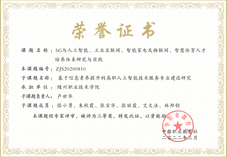 近日,从中华职业教育社传来喜讯:由我校卢世华老师主持的中华职教社课题《基于信息素养提升的高职人工智能技术服务专业建设研究》(课题编号:ZJS20200810),经中华职教社课题评审委员会评审顺利结题,并荣获三等奖,实现了我校国家级研究课题结题并获奖的新突破,为学校争得了荣誉。