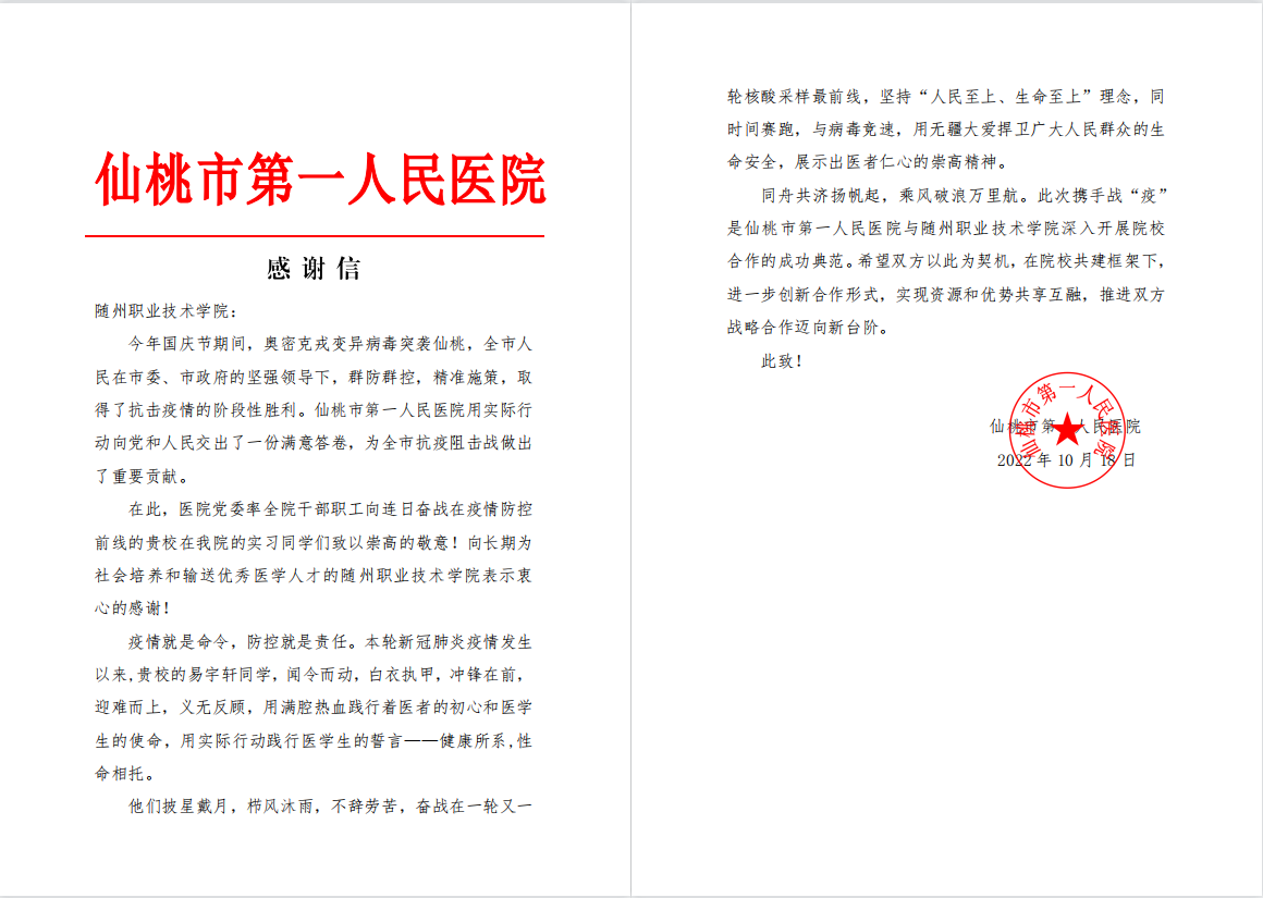 近日,我校收到仙桃市第一人民医院的一封感谢信,信中对奋战在疫情防控前线的我校医学院2020级临床1班的易宇轩同学表达了感谢,同时向长期为社会培养和输送优秀医学人才的星空游戏新版本攻略表示衷心的感谢!