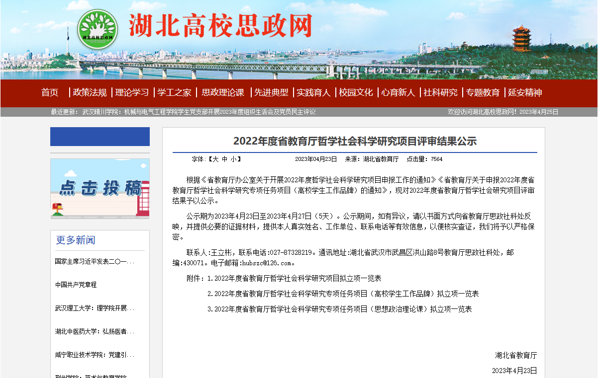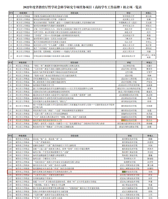 近日,湖北省教育厅组织开展的2022年湖北省高校学生工作精品项目立项评审结果已公布,学生工作处处长钟守兵主持的《如何开展有效的家校协同育人工作》项目,入选班主任工作精品项目,信息工程学院副院长李娟主持的《如何发挥班会阵地做好学生思想政治教育工作》入选辅导员工作精品项目。