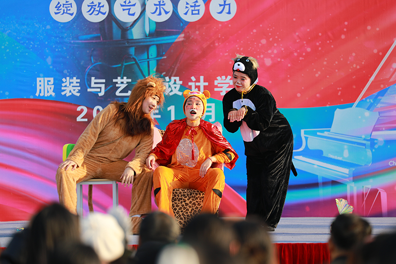 由21级学生周妍、何康宁、林子丁、卢禹彤、洪珊珊等人带来的儿童剧《没有牙齿的大老虎》台词语言诙谐,同学们表演栩栩如生。大老虎的愚蠢与贪吃,狐狸的狡猾,狮子的江湖气,小狗顺从的模样,都被同学们从神态到表情再到动作,把细节琢磨到位,节目引来了台下观众的一片笑声。