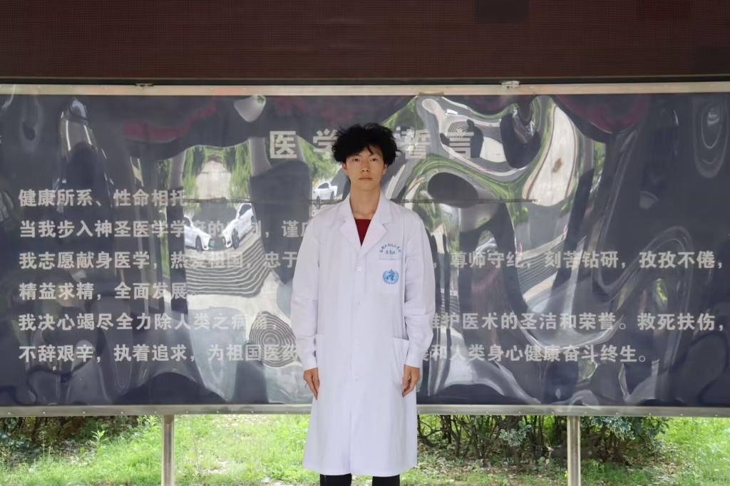 图为周淦同学在医学院医学生誓言前留影