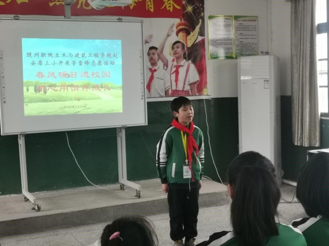 花也开,春已至,岁月向荣,万物勃发。3月24日,为增进青年大学生和寄宿学生的相互了解,为留守儿童送去温暖和关怀,激励孩子们认真学习、快乐生活,我校土木工程与建筑学院一行60余名大学生志愿者来到随县安居镇第三小学开展“学雷锋献爱心”活动。