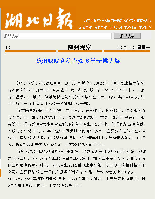 湖北日报:随州职院育桃李众多学子挑大梁