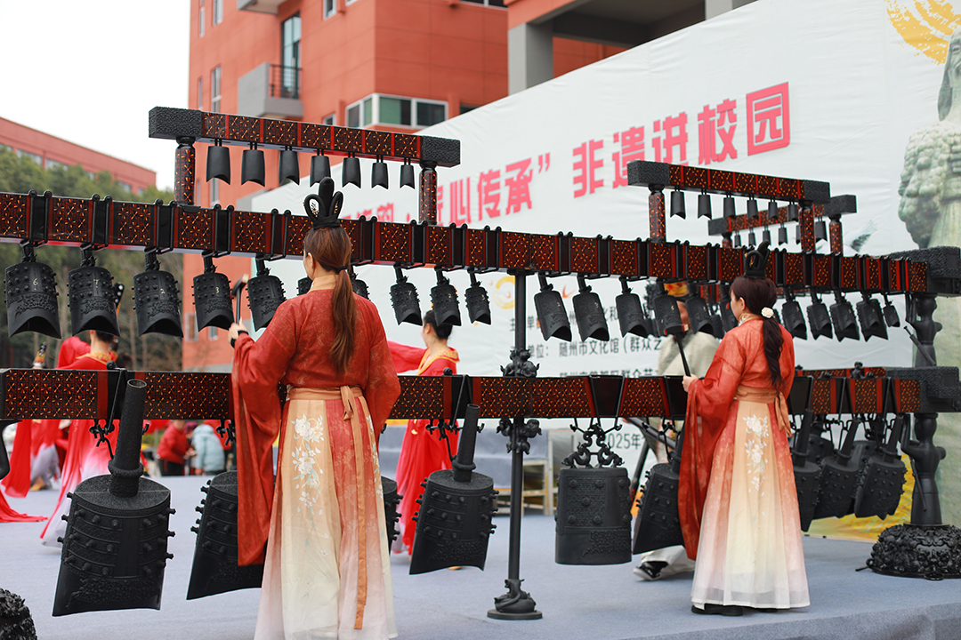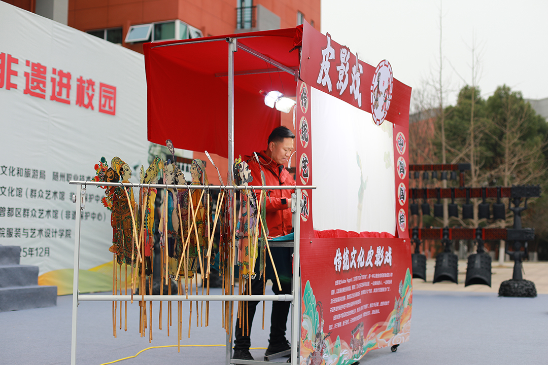 活动以“静态展示+动态展演”双线呈现。静态展区内,20余块非遗展板集中展示随州花鼓戏、青铜编钟制作技艺、曾都皮影、楚式漆器髹饰技艺等曾都各级非遗项目,搭配非遗展位和实物展品,让师生直观感受传统技艺魅力。动态展演环节,精彩纷呈的文艺展演轮番上演。激昂的《威风锣鼓》点燃全场热情;学校服装与艺术设计学院合唱团带来的合唱《小雅·鹿鸣》,唱出青春与传统的共鸣;非遗传承人表演的花鼓戏《十八相送》情感真挚、石排箫独奏《秋恋》韵味悠长;张志刚团队的皮影戏《武松打虎》凭借精湛技艺赢得阵阵掌声;压轴登场的编钟乐舞《编钟敲起来》,将整场活动推向高潮,让师生沉浸式感受青铜文化的千年魅力。